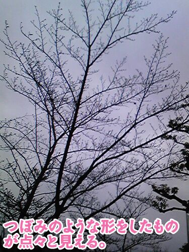 今度こそ… 今度こそ…! 今度こそ家の近くの桜の木を撮影してきたぞ!! 今度の桜の木は100%本物だ! 開花が近づいているぞ!! ご覧いただこう!! ――つぼみをもう少しズームしてみよう…。↓ (もう少しじゃない! これが携帯カメラの限界なんだ…(>_ これは…