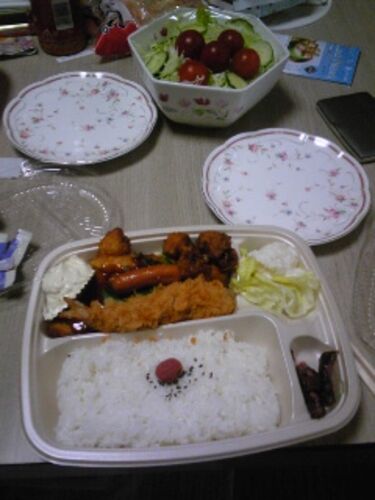 今日の夕飯。 ほか弁(ほっかほっか亭)の 『チキン南蛮スペシャル』、 それと サラダだ。 食えてよかった…。 明日学校だから、今日の夜食えないとなるときついし…(>_<) だが学校の直前の朝食はもっと大切。 明日朝食えなかったら‥‥ ――明日考えよう。 ィヨロシ…